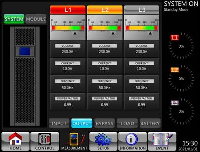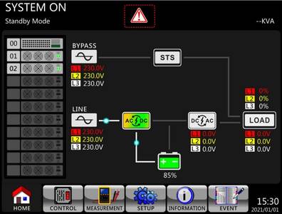 7-calowy wyświetlacz LCD, zaprojektowany specjalnie dla naszej serii zasilaczy awaryjnych. Ten kolorowy, dotykowy panel oferuje intuicyjny dostęp do wszystkich kluczowych informacji i funkcji urządzenia. Dzięki czytelnym piktogramom można łatwo sprawdzić aktualny tryb pracy zasilacza UPS, poziom naładowania baterii i obciążenie systemu. Wyświetlacz pozwala również na szybki odczyt alarmów i ostrzeżeń, zapewniając dodatkowe bezpieczeństwo i kontrolę.