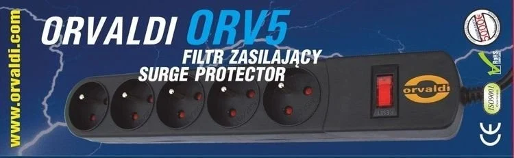 Filtr zasilania ORVALDI - modele ORVALDI ORV5 są wyposażone w 5 gniazd i podstawową ochronę przeciwprzepięciową 210J. Modele filtrów ORVALDI ORV5 są wyposażone w kable o długości 1,5; 3 i 5 m.