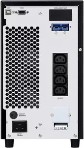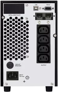 UPS jest wyposażony w porty USB i RS232, a także gniazdo karty SNMP, co umożliwia łatwe zarządzanie i zdalne monitorowanie z komputera, zwiększając bezpieczeństwo podłączonych urządzeń.
